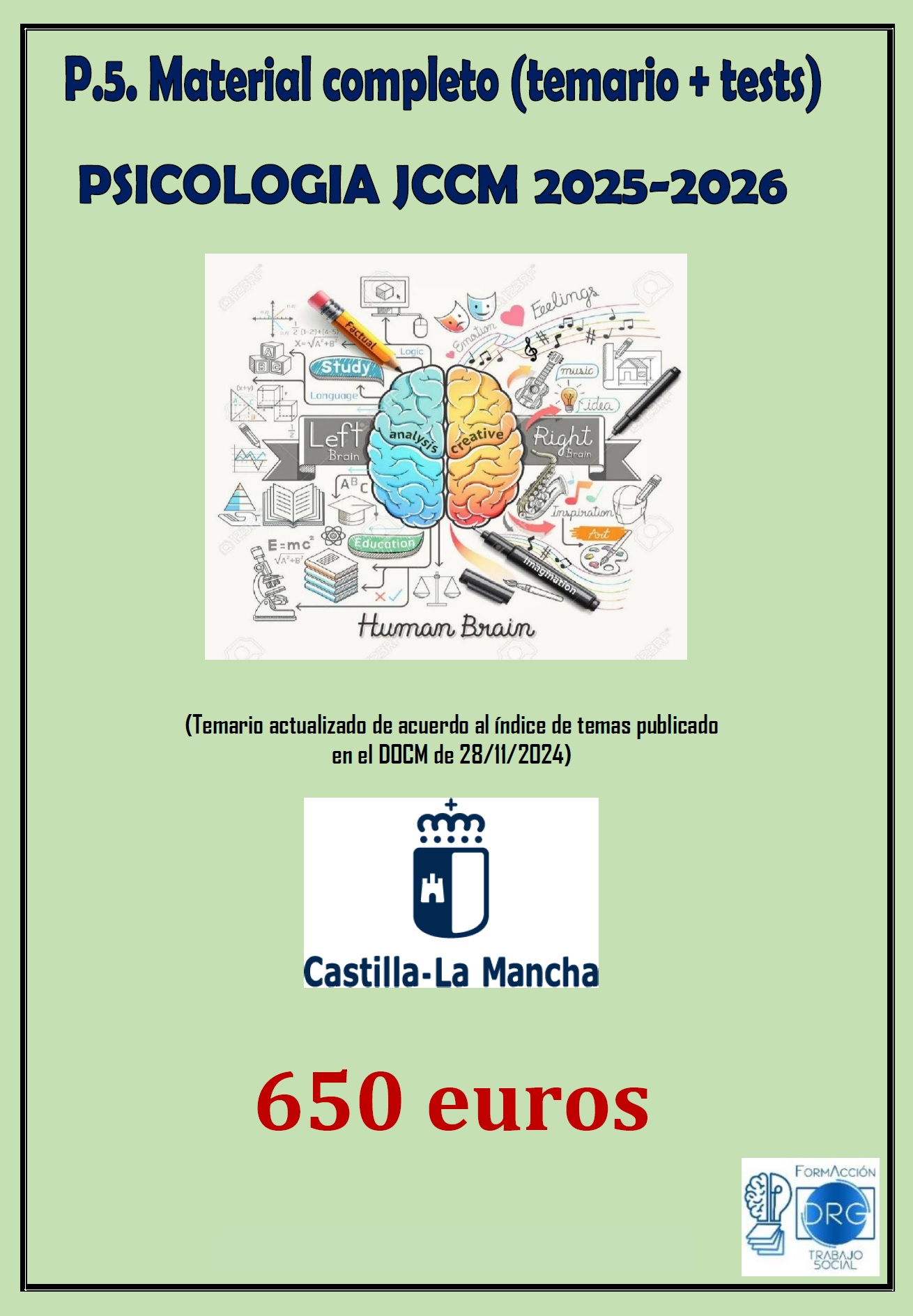 Temario completo compuesto por los 105 temas del temario específico + 24 temas del temario general del Subgrupo A1 y 4.500 preguntas test para practicar de acuerdo al índice oficial publicado en el DOCM de fecha 28/11/2024